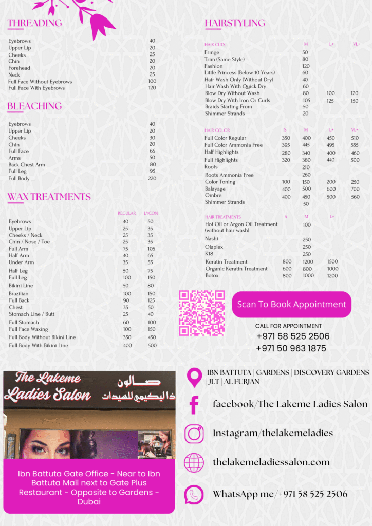 THE LAKEME LADIES SALON HOME Home Service Book Your Appointment Choose The Service Clean Up Mini Facial Fruit Facial Skin Whitening Facial Detan Skin Facial Gold Facial Head Massage Neck Massage Shoulder Massage Leg Massage Full Body Massage Eye Brow Bleach Face Bleach Detan Bleach Under Arm Bleach Full Body Bleach Nail Art Nail Extension Normal Manicure Gelish Manicure Kids Manicure Collse Treatment Normal Pedicure Gelish Pedicure Kids Pedicure Collse Treatment Half Arms Half Legs Under Arms Upper Lips Eye Brow Full Legs Full Arms Full Body Full Face Side Face Hair Wash Hair Spa Hair Hot Oil Massage Hair Conditioning Hair Trim Proper Hair Cut Blow Dry Hair Root Hair Color Highlight (Strands Only) Hair Straightening Hair Curls Keratin Treatment(Short Hair) Keratin Treatment(Long Hair) Protein Treatment Send